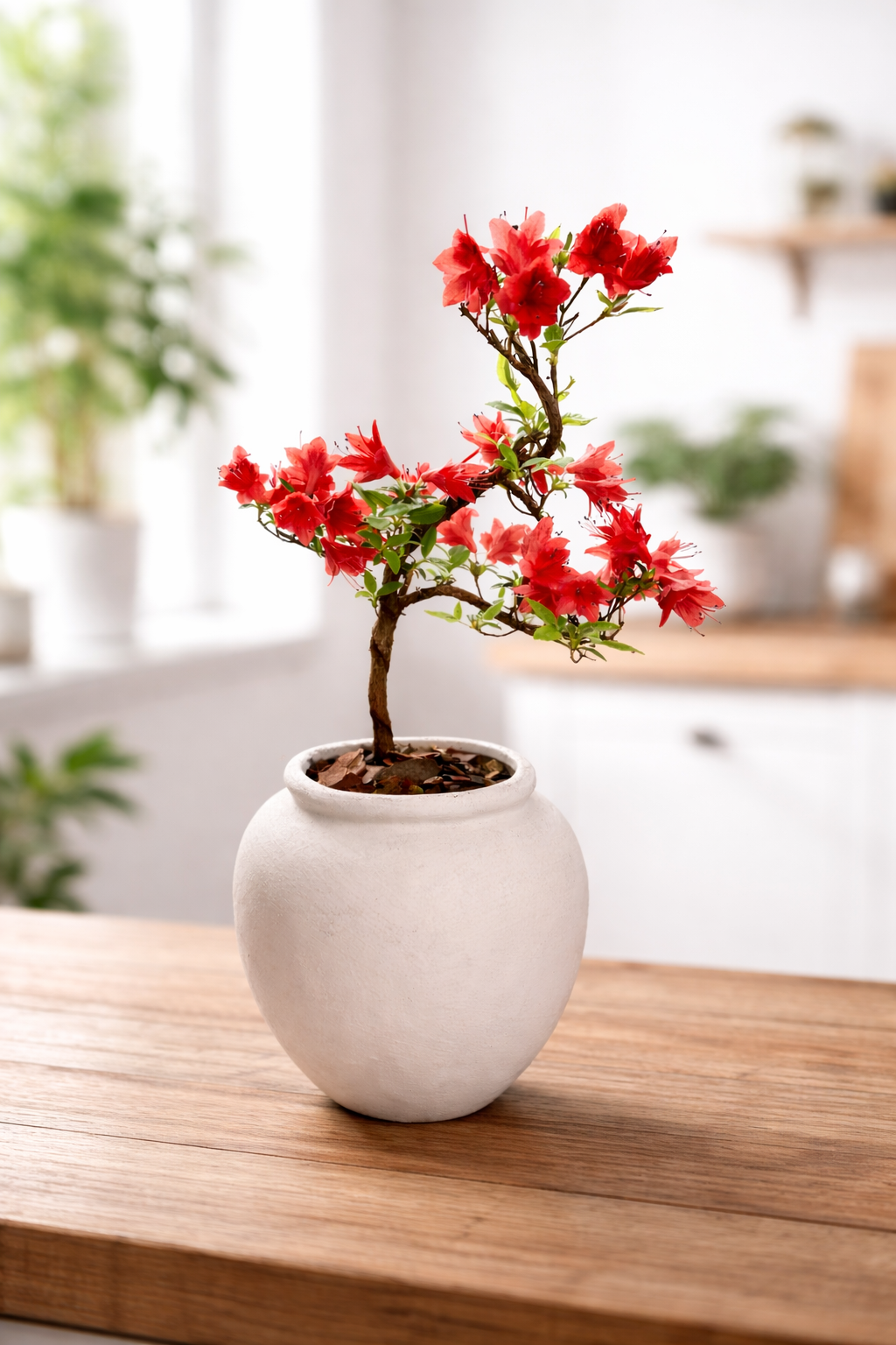 Canlı kırmızı çiçekleri ve zarif bonsai formuyla Açelya, bulunduğu ortama enerji ve sıcaklık katan özel bir tasarım.