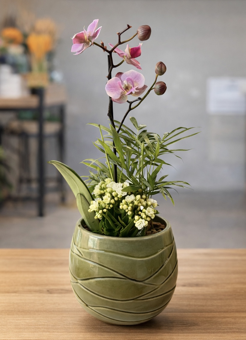 Orchid Harmony, doğanın zarafetini modern tasarım anlayışıyla buluşturan özel bir bitki aranjmanıdır. Parlak dokulu, dalga form detaylı seramik saksı içinde konumlanan pembe orkide, taze yeşil bitkiler ve minik çiçek dokunuşlarıyla dengeli ve sofistike bir kompozisyon sunar.